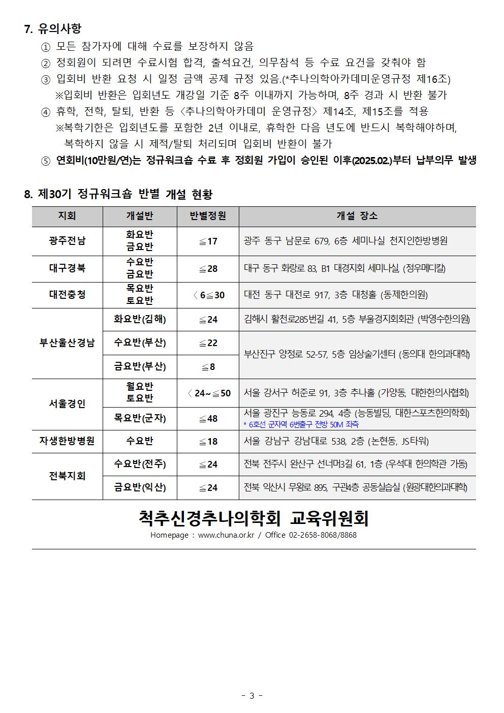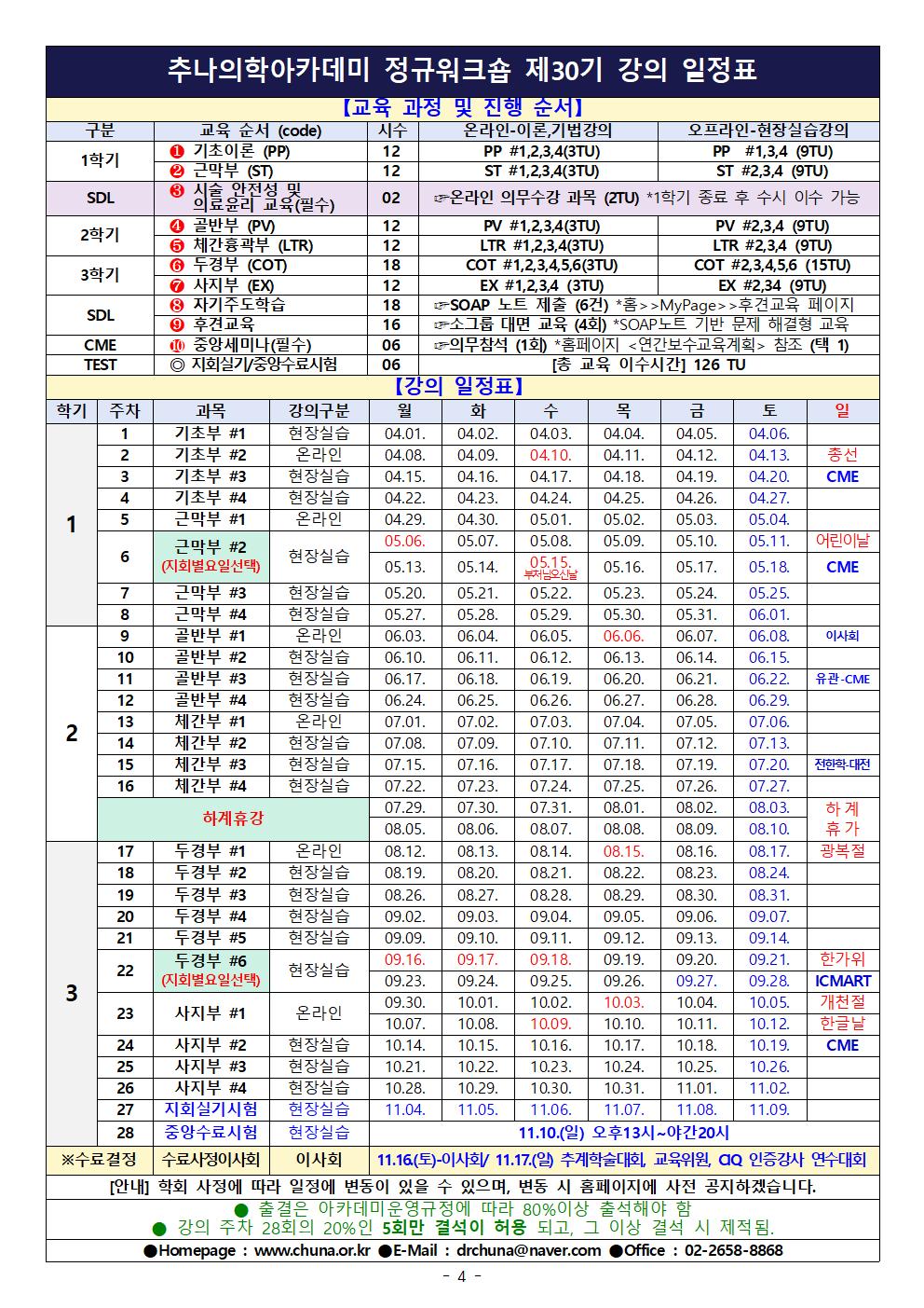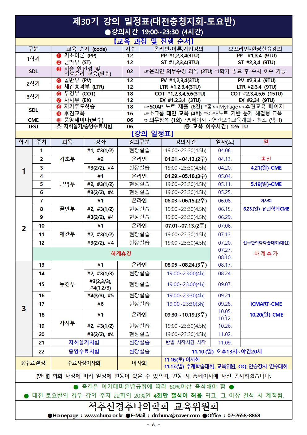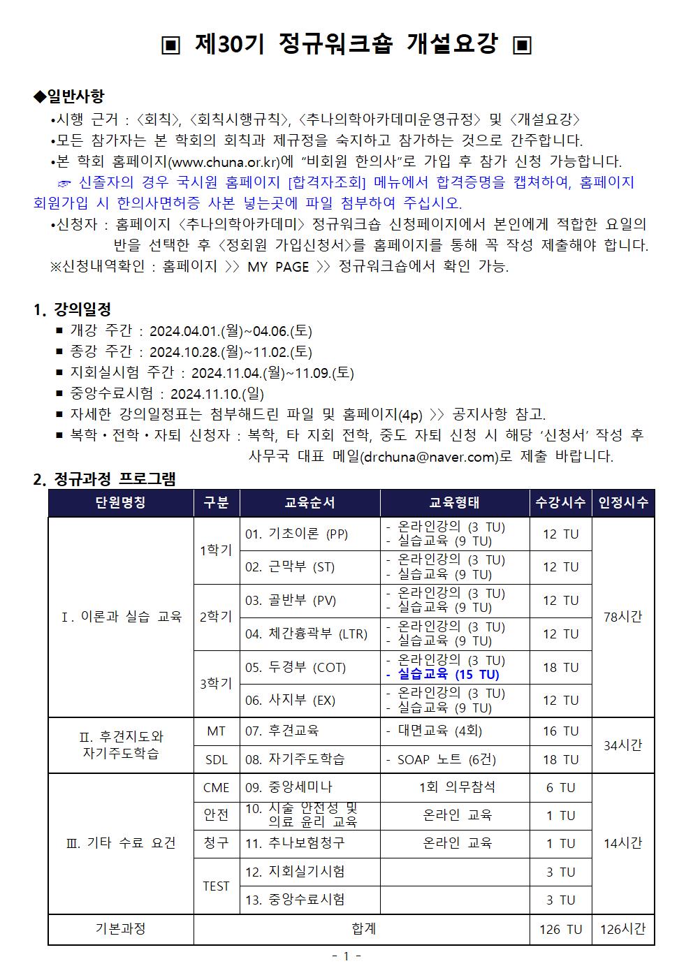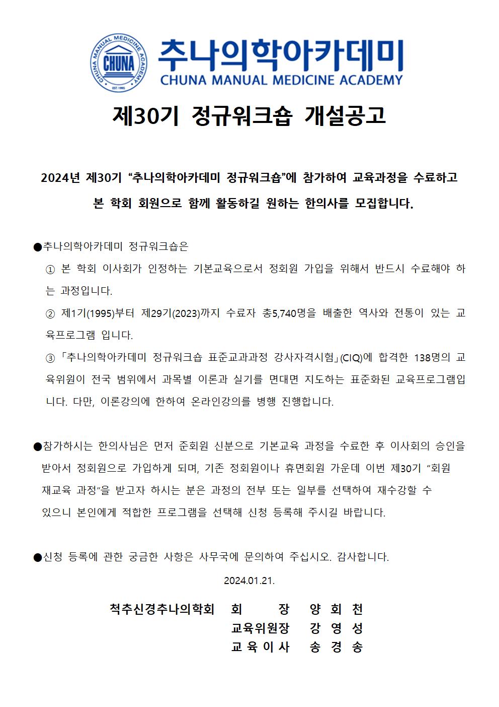 추나의학아카데미 정규워크숍 제30기 개설 공고 및 강의 일정표 공고 페이지 정보 작성자 사무국 댓글 0건 조회 8,635회 작성일 24-02-01 14:36 본문 첨부파일 제30기 정규워크숍 개설공고03.09..pdf (250.4K) 2015회 다운로드 | DATE : 2024-03-13 17:16:19 목록 이전글⟪척추신경추나의학회지》제19권 제1호 게재 논문 공모 24.03.28 다음글2024년도 연간 보수교육 계획표 및 심화과정 일정 24.02.01 댓글목록 댓글목록 등록된 댓글이 없습니다.