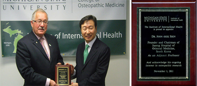 신준식 회장, 미국 미시건주립대학교(MSU) 오스테오패시의학대학 명예교수(Adjunct Professorship) 위촉.